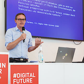 Im anschließenden Panel diskutierten Karen Toppe (Bundesministerium für Digitales und Staatsmodernisierung), Prof. Timo Kob (FH Campus Wien), Felix Nadolni (Bundesdruckerei GmbH), Prof. Felix Biessmann (ECDF/Berliner Hochschule für Technik) sowie Moderatorin Samira Franzel (ECDF) über konkrete Einsatzmöglichkeiten und Herausforderungen von KI in Kommunen und Verwaltungen. Karen Toppe betonte, dass viele Verwaltungen bereits engagiert mit KI-Anwendungen arbeiten, etwa in Form von Chatbots die Bürger*innenanfragen beantworten, Wissensmanagement- oder Trainingsprogrammen. Diese seien im Marktplatz der KI-Möglichkeiten (MaKI) transparent dargestellt. Der Austausch mit der Industrie ist für sie zentral für Innovation, zugleich müsse die Datenhoheit gewahrt werden. Transparenz und Nutzen sowie ethischer KI-Einsatz für den oder die Bürger*innen sei ein entscheidender Faktor, so Toppe, nicht zuletzt für die Akzeptanz in der Bevölkerung. Felix Biessmann hob hervor, dass technische Fairness kein Selbstläufer sei: „Es gibt Dutzende Fairness-Metriken – aber keine einheitliche Lösung. Die Wahl hängt immer vom Anwendungsfeld ab." Wichtig sei daher, unterschiedliche Perspektiven einzubeziehen und Fehlentwicklungen frühzeitig zu identifizieren. Gleichzeitig warnt der Professor für Data Science vor „Over-Trust", also dem fast blinden Vertrauen gegenüber Künstlicher Intelligenz, was dazu führt, dass Ergebnisse nicht hinterfragt werden.